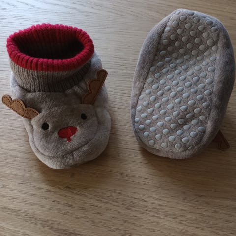 Kuvan tossut / kengät ensiaskeliaan ottavalle pikkuiselle. Taipuisat, ruskeat ovat kauttaaltaan kangasta (= tossut).