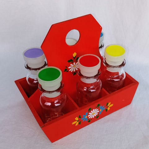 Kaksi maustesirotinta, öljy- ja etikkapullot ja sinappiastia omassa telineessään. Kaikki osat tallessa ja hyvässä kunnossa. Osat pysyvät hyvin paikallaan myös telinettä liikuteltaessa, sopii vaikka grillikesteihin. Nouto Itiksen vierestä tai postikulut M-pakettina ostajalle. Nopea postittaja. Yhdistän paketit pyynnöstä. Katso muutkin ilmoitukseni, runsaasti vintagea, retroa sekä vuosien varrella astiahullun kaappeihin keräiltyä kivaa tavaraa myynnissä.