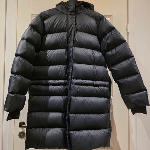 Pintamateriaali: 100% kierrätettyä polyamidia | Toppaus: 90% untuvaa ja 10% höyheniä/100% polyesteriä | Vuorikangas: 100% kierrätettyä polyamidia. "