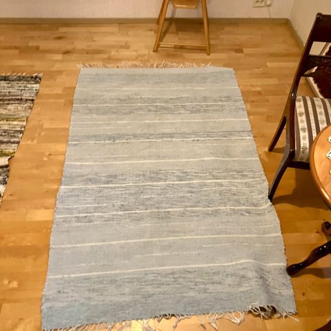 Paksu, napakaksi kudottu puuvillaisen tuntuinen pieni matto. Sisältää varmaan melkein kaikkia värejä. Matto on pesty hajusteettomalla pesuaineella ja kuivatettu kunnolla ennen myyntiin laittoa.