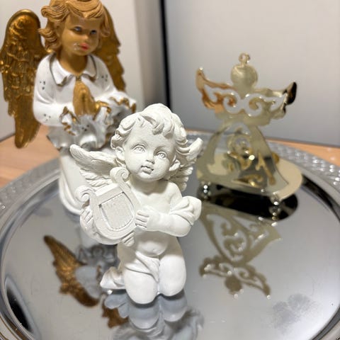 Osa enkelin käsivarresta on liimattu ja korjattu, tarvitsee akun toimiakseen valon.