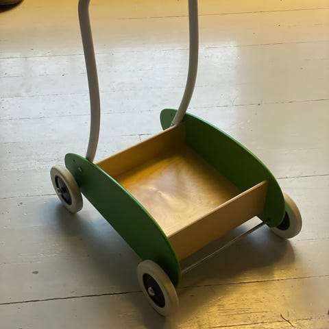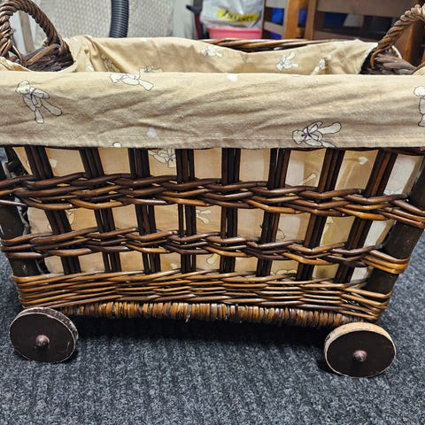 Kaunis vaaleanruskeasta rottingista valmistettu vaunu esim. lelujen säilytykseen. Myynnissä kaksi saman sarjan lelukärryä. Isomman korkeus 34 cm ja kärrykopan mitat 49 x 38 cm. (myyty) Pienemmän mitat: korkeus 35 kahvojen kanssa ja kärrykopan mitat 38 x 28 cm. Vaunussa on puupyörät ja pellavanvärinen kankainen sisuspussi, jonka reunassa on vanhanaikaisia nallenkuvia. Kumpikin vaunu on kankailtaan puhdas ja muutenkin uudenveroisessa kunnossa. Kärry on kaunis lastenhuoneen sisustuselementti. Myynnissä yhdessä tai erikseen. Myynnissä Lohjalla, mutta kulkeutuu ilman postimaksua omien menojen mukaan Kamppiin ja Espoon Ikealle. Hp. 30 euroa pienempi (iso myyty)