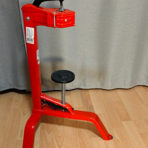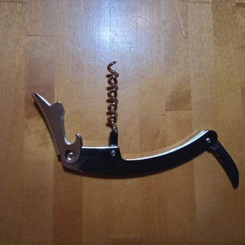 Viinipullojen korkittaja. Punainen käsityökalu, jossa metallinen runko ja punaiset kahvat. Työkalussa on useita liikkuvia osia, jotka mahdollistavat sen käytön viinipullojen korkituksessa. Hinta vain 9 euroa. Voin lähettää. Mmm.