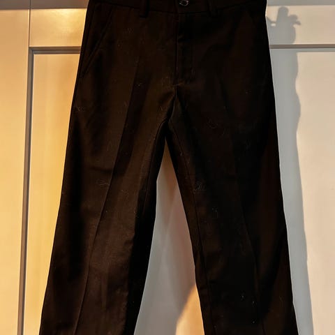 Koko 110 mustat puvun housut pojalle. Z-collection. Polyester. Vyötäröllä vetoketju ja kuminauha. Sivuissa taskut. Hyvä kunto. Housut on suunniteltu pojille ja niissä on vyölenkit sekä napitus edessä. # juhlahousut