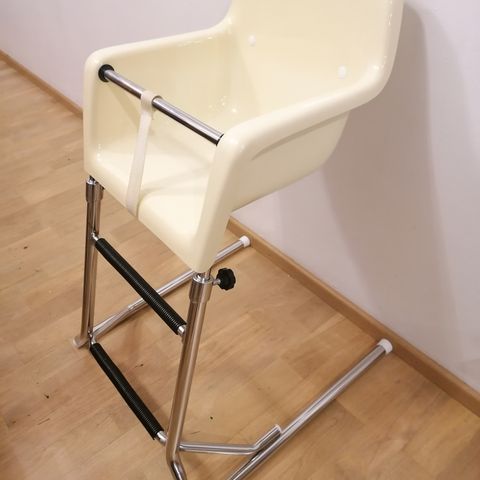 Käytön jälkiä ja likainen mutta tukeva lasten syöttötuoli.