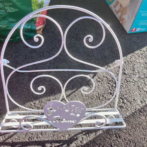 Valkoinen metallinen keittokirja/tablettiteline. Söpö ja romanttinen. Postitus onnistuu toimituskulut maksaa ostaja.