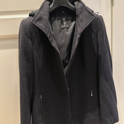 Barbara Lebekin villakangastakki kokoa 38. Takissa on edessä kaksi taskua ja povitasku, kiinnitys napeilla (varanappi mukana). Mitat: olka-olka 42cm, kainalo-kainalo 53cm ja olka-helma 84cm.