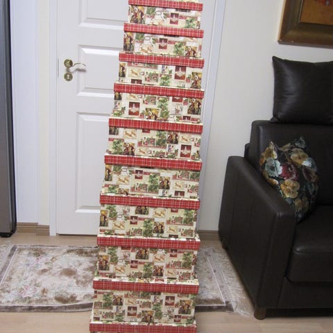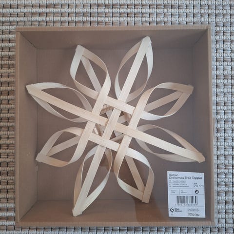 Käsityönä tehty, puukolla vuoltu perinteinen lastukuusi-joulukoriste. Korkeus 20 cm.