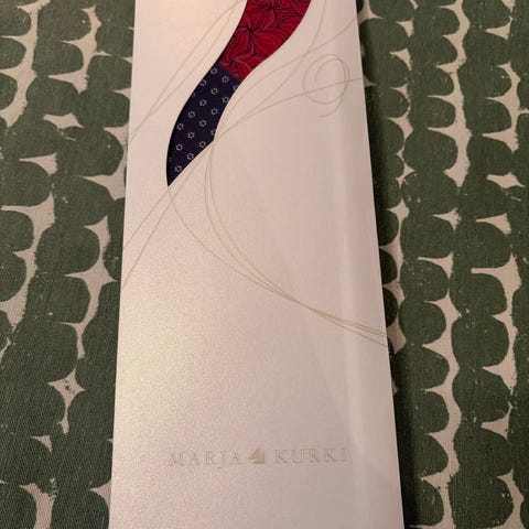 Marja Kurki miesten solmio, oranssin sävyinen, raidoitettu malli. Solmio on valmistettu laadukkaasta materiaalista ja sopii miehille. Solmio on uusi ja käyttämätön. Solmio myydään alkuperäisessä pakkauksessaan. Olen saanut solmion yrityslahjaksi. Tästä johtuen solmion takana solmiota sitovassa lenkissä lahjan antaneen yrityksen nimi.