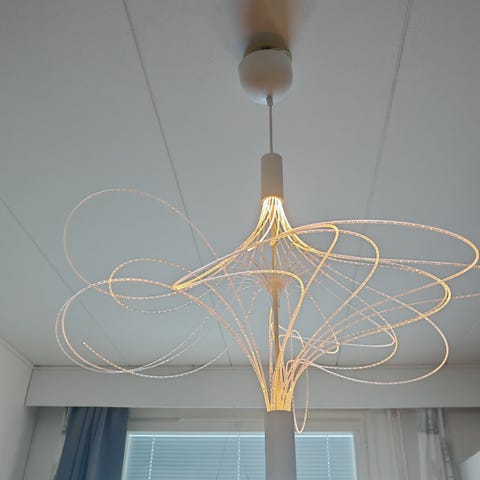 Vanha muovinen kattovalo. E27 kanta, polttimo sisältyy. Sokeripalaliitos. Retro