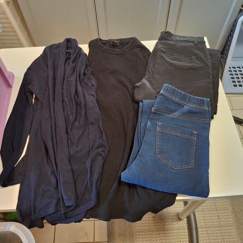 Yhteishintaan. Koot S-L, chinot, reisitaskuhousuja, merinovillatsut, cargot jne. Kengät 36, 37 ja 38. Vain nouto ja käteinen. Saa myös tarjota vain osasta.