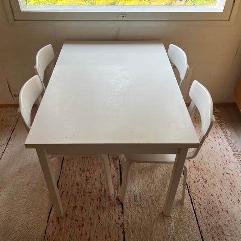 Myydään 6 hengen ruokailuryhmä, jatkopalalla. Täyttä puuta, virheetön. Leveys 100cm, pituus 150+ jatkopala 47cm. Tuolit päällystetty kahdella eri kankaalla, virheettömät alkuperäiset alla.
