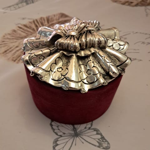 Korurasia, jossa on koristeellinen kansi ja punainen samettivuori.