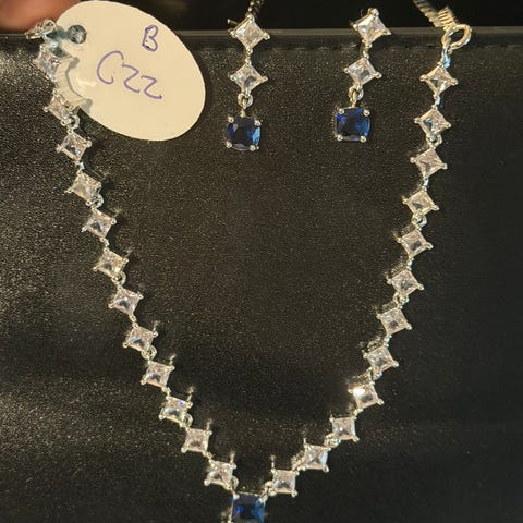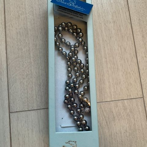 Käyttämätön, rhodiumpinnoitettu Blue Dolphin -korusetti, joka sisältää kaulaketjun sydänriipuksella ja sydämenmuotoiset korvakorut. Koruissa on Swarovski kristallikiviä.