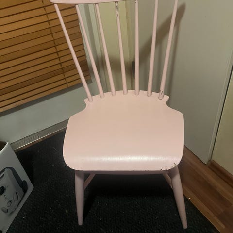 Kaunis vanha pinnatuoli kunnostettavaksi. Tuoli on periaatteessa ihan tukevaa tekoa ja muuten hyvässä kunnossa, mutta sekä selkänojan pinnat että jalat natisevat liitoksistaan ja irtoilevat. Yksi alapinnoista on kokonaan poikki (sen saa toki mukaan). Siksi tuoli tarvitsee kunnon liimausta, ja myös maalipinta kaipaa fiksausta. Tuolin korkeus n. 80 cm, istuinkorkeus n. 42 cm ja istuinosan halkaisija n. 37 cm. Hinta 15€. Nouto Espoosta Kauklahdesta. PS. Katso ilmoituksen viimeinen kuva ehjästä tuolista. Ehjä tuoli ei ole myynnissä.