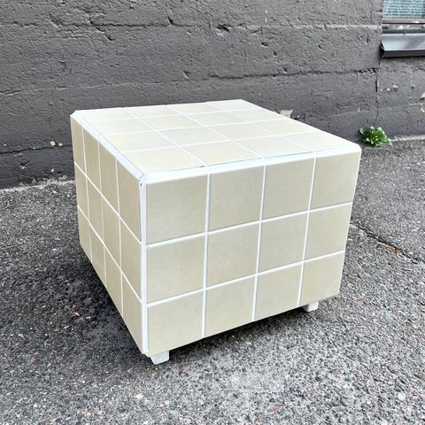 Pöytä/kuutio on tehty mosaiikkilaatoista ja maalattu kauttaaltaan valkoiseksi. Runko on peräisin vanhasta rahista. Maalipinta ja saumaukset eivät ole täysin tasaisia (katso kuvat), mutta näyttää kauempaa katsottuna siistiltä.