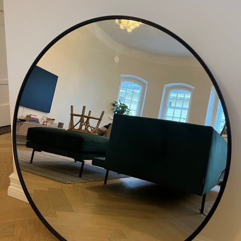 Rusta Peili Micke pyöreä peili, halkaisija 110 cm. Peilin kehys on musta, materiaalia ei ole erikseen ilmoitettu. Sopii seinälle asennettavaksi.