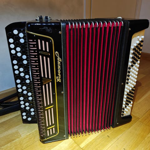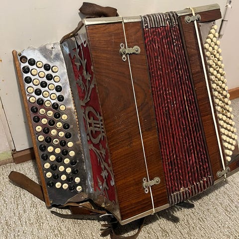 Vanha haitari uusilla olkaremmeillä. Kuljetussalkkukin löytyy mukaan. Pelimanni muistelee jo menneitä ja itse en osaa soittaa.