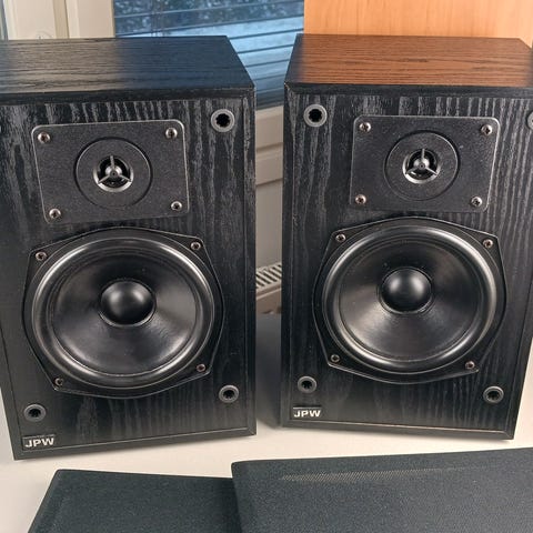 JPW Mini Monitor kaiuttimia 5kpl ja Audio Pro ace-bass B 1.35 subwoofer. Kaiuttimet soveltuvat äänen toistoon erilaisissa järjestelmissä, ovat olleet kotiteatterikäytössä. Subbarin lakkapinnassa pieniä naarmuja. Monitorikaiuttimissa kahdesta puuttuu etukangangas, yhdessä pieni lommo kartion keskiössä ja kahdessa kaiuttimessa vahvikelevy seinäkiinnitystä varten. Yleisvaikutelma siisti ja soivat hyvin. Seinäkinnikkeet (2kpl) saa mukaan.