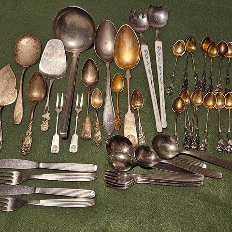 Vanhoja aterimia ja ottimia mm.Scandia, ruusulusikoita, kakkulapioita,sakset.