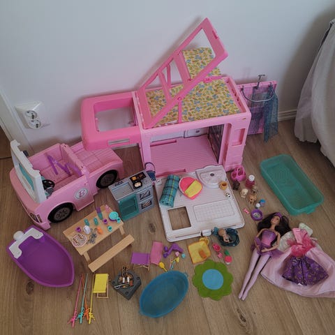 Hyvä kuntoinen barbie matkailuauto jossa mukana lähes kaikki mitä uutena oli.