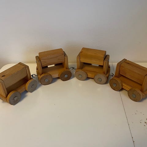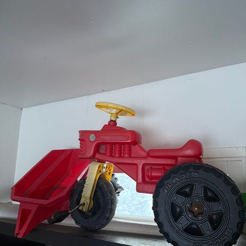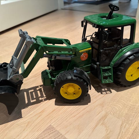 Puinen ehjä traktori. Maalipinnoissa näkyy leikityt leikit, yleisilme ihan siisti. Kauha nousee ja liikkuu. Traktorin pituus noin 28 cm