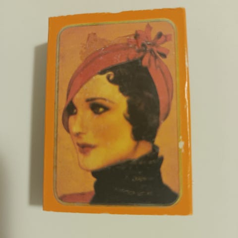 Tulitikkurasiat naisfiguuri Teneriffa 7 kpl, yksi autokuva. Ollut teipissä monta vuotta. Maisemakuva liimattu