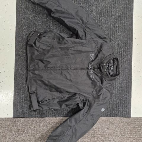 Richa Schoeller Dynatec moottoripyöräasu musta, valmistettu kestävästä, sateen ja tuulenpitävästä materiaalista. Sisältää takin ja housut, koko XL. Mukana mustat moottoripyöräsaappaat kokoa 43.