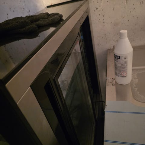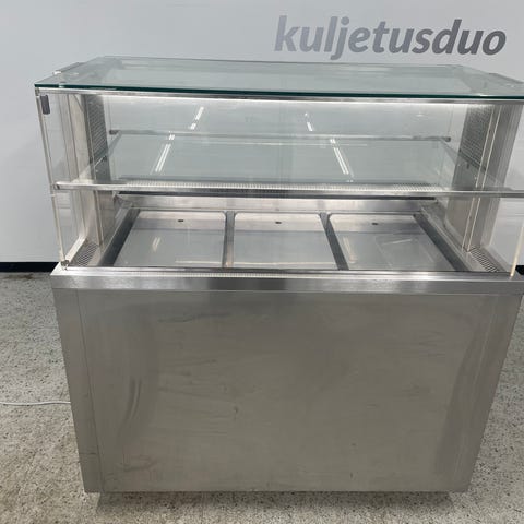 Vanha Skycold-vitriini kylmäaltaalla ja kaapeilla. Etupuolelta sivuseinämän nurkasta pala irronnut, pala tallessa.