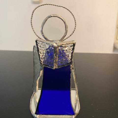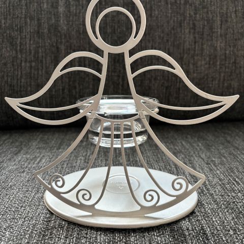 Enkeli tuikkulyhty , jossa enkeli keltaisissa hiuksissa ja hopeanvärinen tähtikuvioitu mekko. Hahmolla on siivet ja se on suunniteltu sisätilojen koristeeksi.