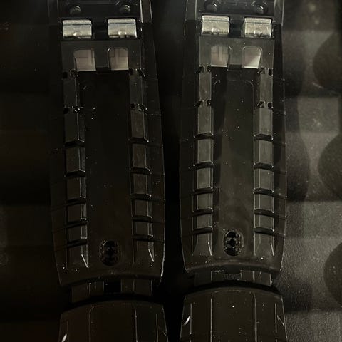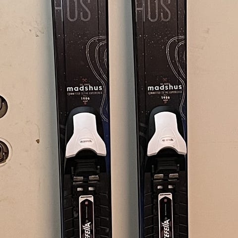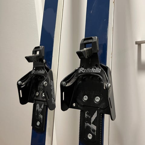 Hyväkuntoiset täyspitkillä teräsreunoilla olevat tunturisukset (Backcountry) siteineen.
