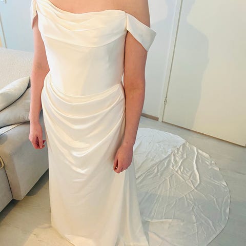 Häämekko, hääpuku, käytetty hääpuku, käytetty häämekko, secon hand-hääpuku, Sis Idman, Sis Idmanin hääpuku, satiininen hääpuku, satiinimekko, A-linjainen, mukava hääpuku, hääpuku laahuksella, häämekko laahuksella, off shoulder-häämekko, off shoulder, näyttävä laahus