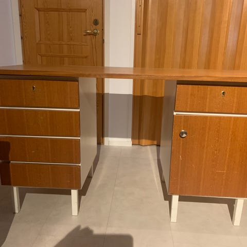 Vanha pankissa työpisteen pöytänä ollut pöytä. Jalka osa puuttuu. Edessä kaksi vedettävää laatikkoa.
