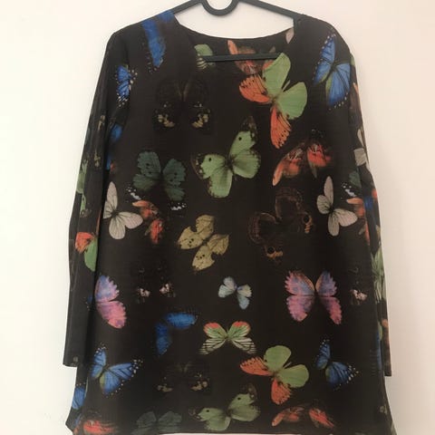 Raikas, kesäinen ja kevyt hameasu. Hametta ja puseroa voi tietenkin myös pitää erikseen. Asun kangas kreppimäinen. Puserossa kevyet toppaukset. Kokonumeroa ei löydy, mutta asun käyttäjä käyttää L ja XL kokoisia vaatteita.