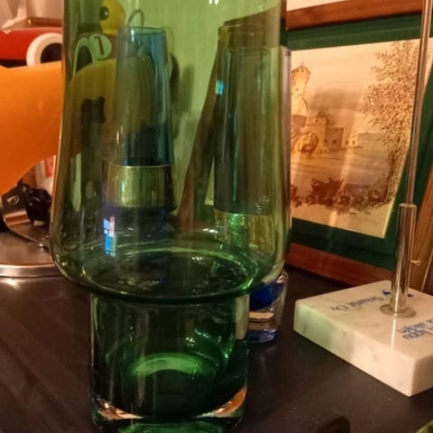 Riihimäen lasin Tamara Aladin siniharmaa maljakko 1462, korkeus 22 cm. Yksi pieni jälki suuaukon reunassa, katso viimeinen kuva. Vain nouto Espoon Miilukorvesta.