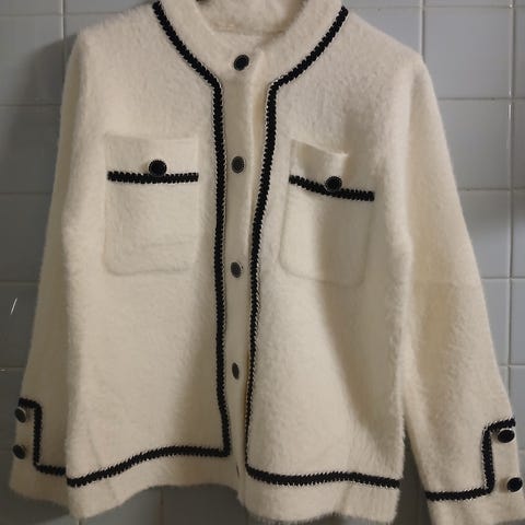 Hyväkuntoinen kirkkaanpunainen neuletakki tai neulemekko, jossa napit. Tyköistuva/vartalonmyötäinen malli, hieman levenevä helma. V-kaula-aukko. Koko n. XS-S.