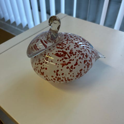 Pieni lasinen koriste-esine, muotoiltu linnuksi. Väri on siniharmaa läpikuultavalla ulkokuorella. Sopii koristeeksi kotiin tai keräilyesineeksi.