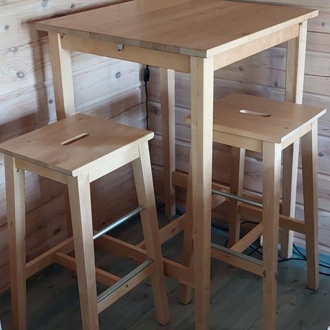 Pyöreä valkoinen baaripöytä metallijalustalla ja kaksi tuolia säädettävällä korkeudella. Kunto mielestäni hyvä. Pieni käytön jälki pöydän kulmassa, näkyy kuvassa. Vain nouto.