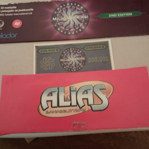 Erilaisia pelejä. Alfapetit, katamino, arvaa kuka hyvässä kunnossa, Afrikan tähdessä, monopolyssa käytön jälkiä, mutta hyvin pelailee vielä. Kimblen pakkaus hajonnut, noppakuola sumentunut, oppi ja ilo-juttuja. Ei piirustuksia näissä. Tarjoa