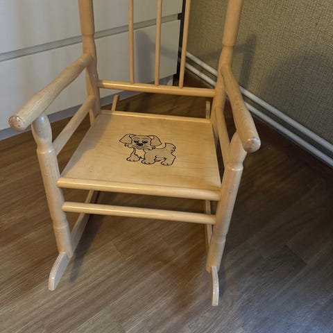 Ruskeaksi maalattu lasten keinutuoli. Maali paikoin kulunut.