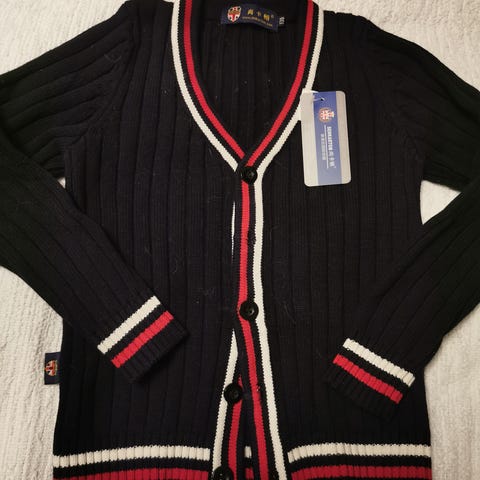 Neuletakki, väri tumman sininen, punainen, valkoinen, koko 140cm, käyttämätön ja uusi.