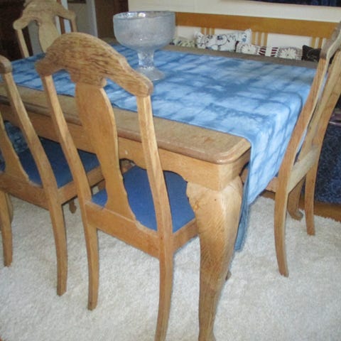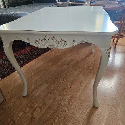 Kaunis talonpoikais mallin pöytäryhmä. 20-luvulta. Maalattu jälkeenpäin antiikin valkoisella. Kaunis setti! Jatkopaloissa hieman maali rapistunut (kuvattu). Vähäisiä käytönjälkiä.