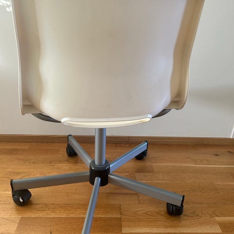 IKEA lasten tuoli, jossa on tharmaa istuin ja valkoinen runko. Tuolissa on pyörät. Sopii lasten käyttöön esimerkiksi työpöydän ääressä.
