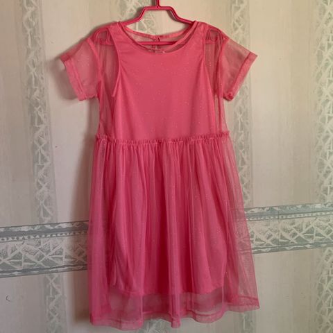 Vaaleanpunainen röyhelömekko kimallekoristein, koko 130. Huomaathan kuvista, että pääntiessä ja nauhoissa on värjäytymää. Yläosaa koristaa kimallekivet, takana vetoketju pukemisen helpottamiseksi.
