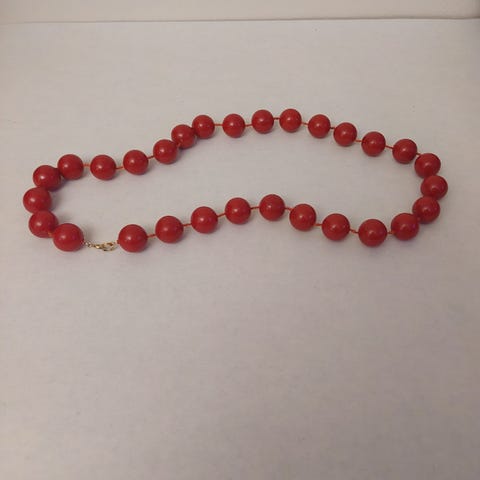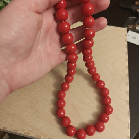 Myydään yhdessä punaiset helmet, pituus noin 60cm, sekä violetit muovihelmet, pituus noin 58cm.