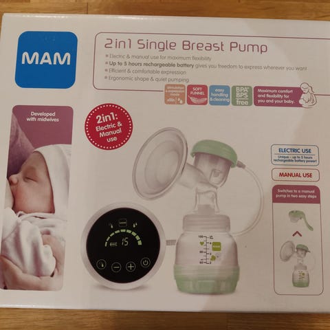 MAM 2in1 Single Breast Pump rintapumppu sisältää sähköisen ja manuaalisen pumpun. Mukana on imukuppi, säiliö maidon keräämiseen, sekä ohjainyksikkö, jossa on kosketuspainikkeet. Tuote on suunniteltu rintamaidon pumppaamiseen ja keräämiseen. Väri on vihreä ja valkoinen.
