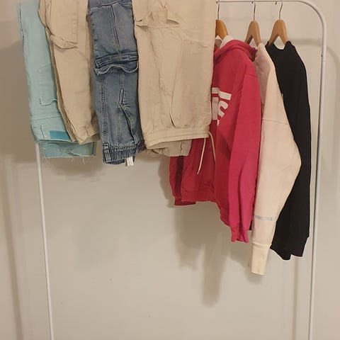 Sisältää 3 shortsit, mekon, topin, kapealahkeiset farkut, collegetakin ja neuletakin. Kaikki hyväkuntoisia.