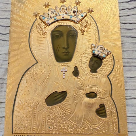 Puusta tehty Ikoni Neitsyt Maria ja Jeesus lapsi puulevy