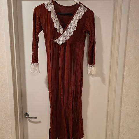 Kaunis 130cm (olkahelma) pitkä yömekko, kai-kai noin 47cm. Ihanat pitsiset somisteet. Laput leikattu, käyttöönotto pesty, mukavan tuntuinen päällä (samanlaisia vastaavia käytetty useita) Tästä vaikka lahjaksi.