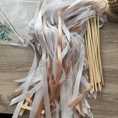 Valkoiset huiskat 17kpl. Meillä käytettiin häissä kirkosta poistuessa. Tikun päässä kilisevät kulkuset. Tosi hyvässä kunnossa, mutta on mahdollisuus, että jotain pieniä jälkiä saattaa olla jäänyt joihinkin